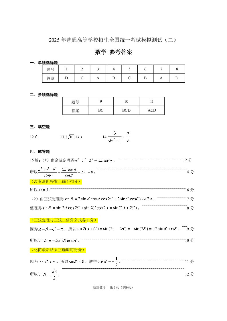 广东省区域高中2025年普通高等学校招生全国统一考试模拟测试(二模)数学评分细则