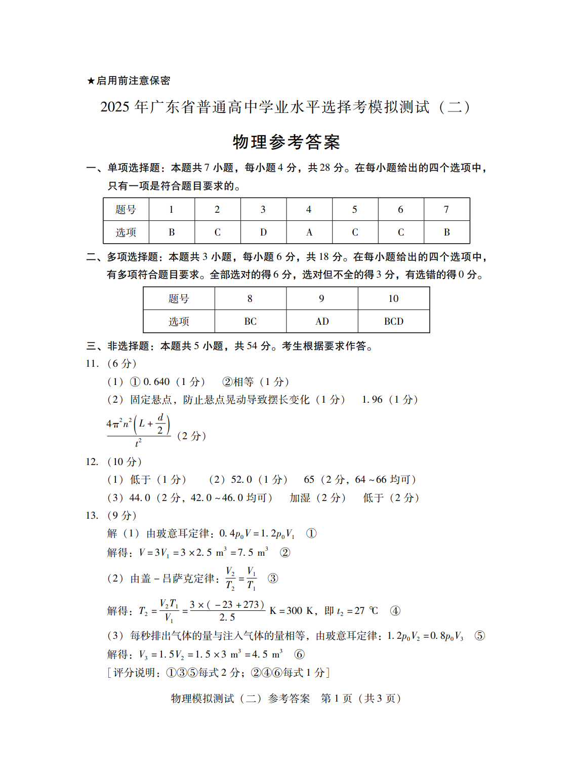 广东省区域高中2025年普通高等学校招生全国统一考试模拟测试(二模)物理答案