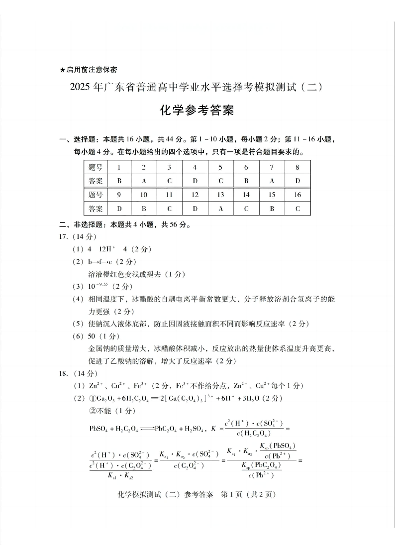 广东省区域高中2025年普通高等学校招生全国统一考试模拟测试(二模)化学答案