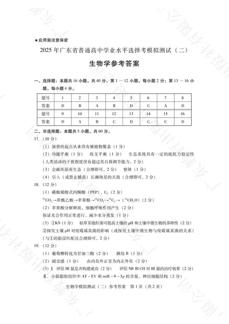 广东省区域高中2025年普通高等学校招生全国统一考试模拟测试(二模)生物答案