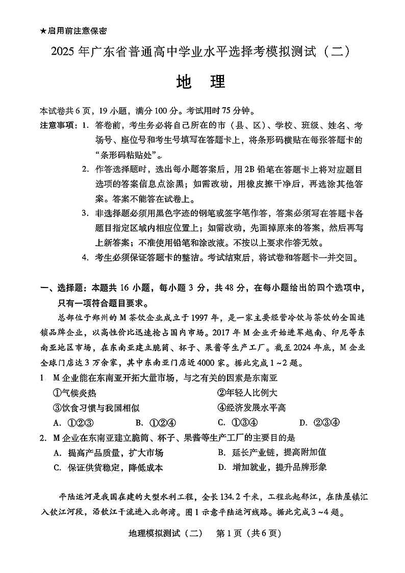 广东省区域高中2025年普通高等学校招生全国统一考试模拟测试(二模)地理