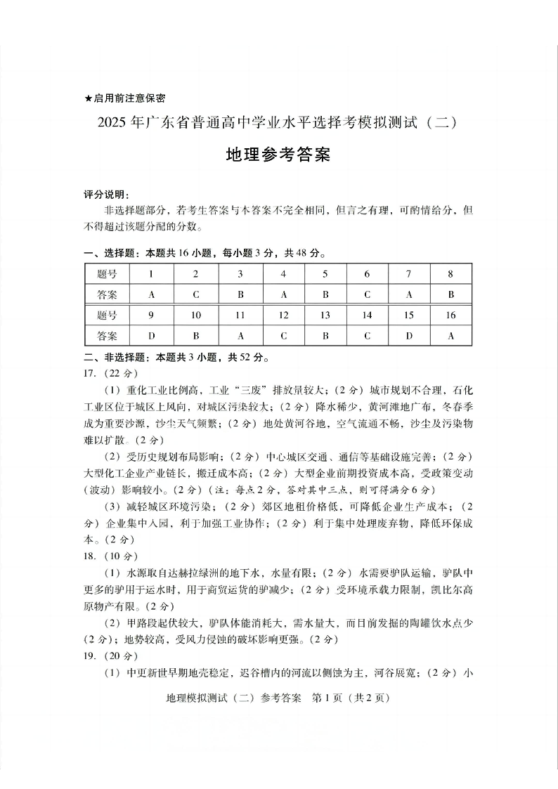 广东省区域高中2025年普通高等学校招生全国统一考试模拟测试(二模)地理答案