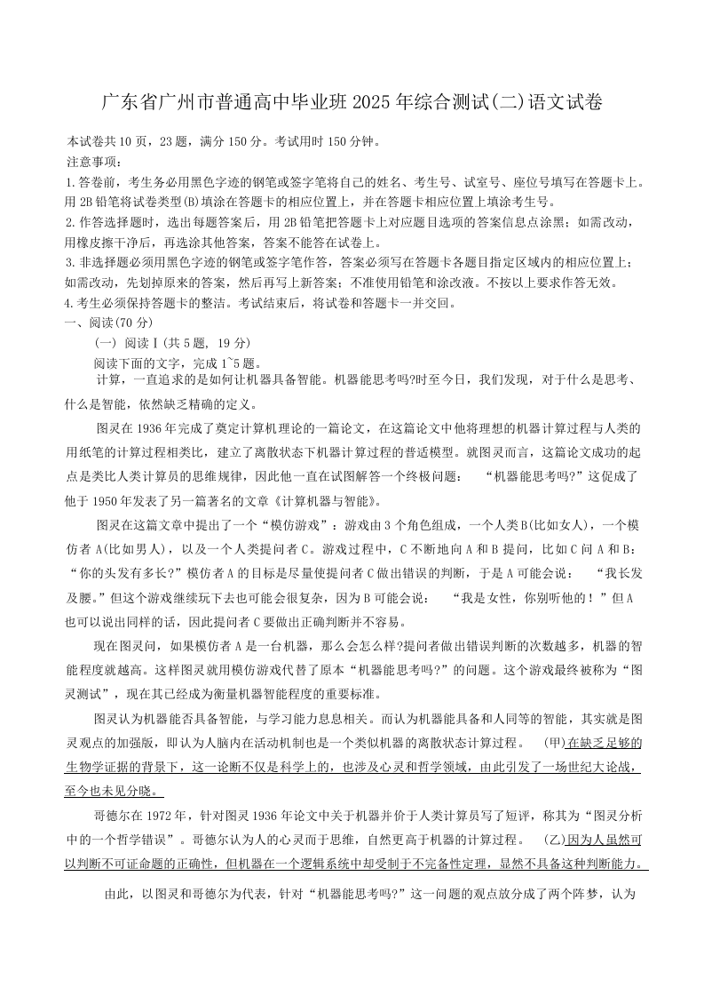 广东省广州市普通高中毕业班2025年综合测试(二模)语文+答案