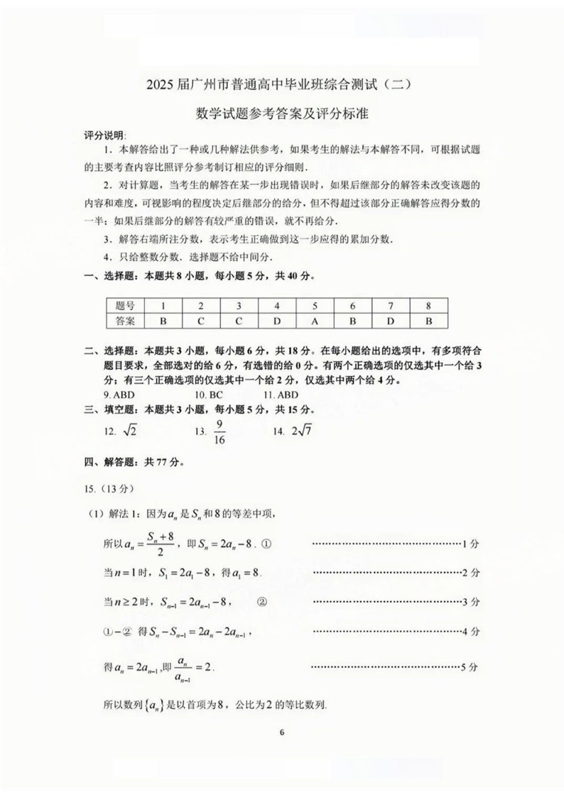广东省广州市普通高中毕业班2025年综合测试(二模)数学答案