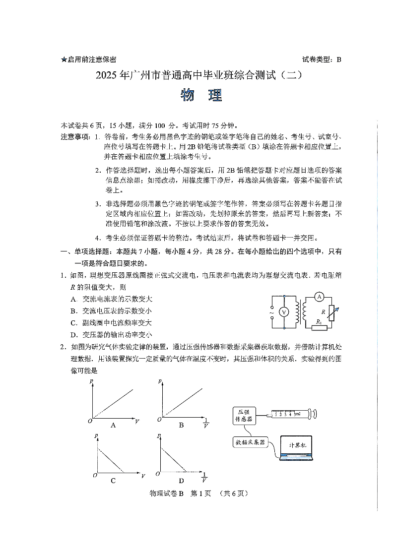 广东省广州市普通高中毕业班2025年综合测试(二模)物理