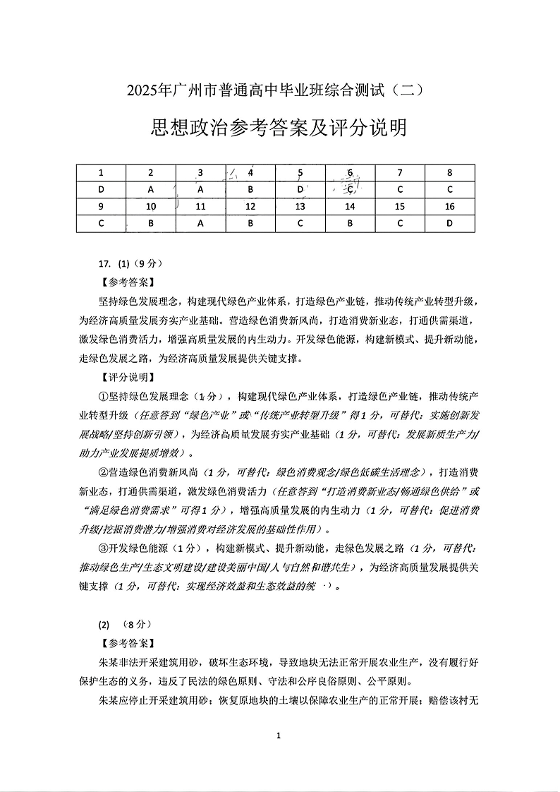 广东省广州市普通高中毕业班2025年综合测试(二模)政治答案