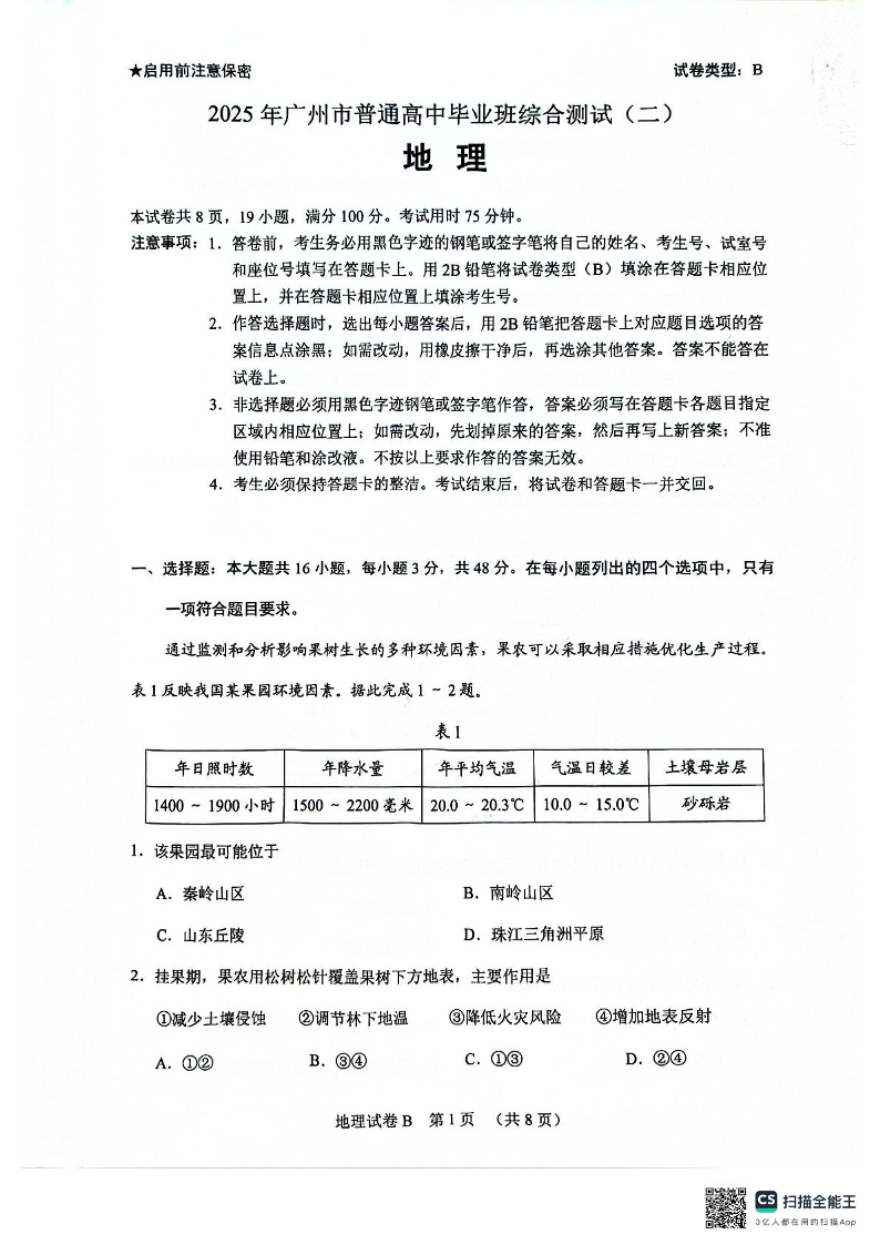 广东省广州市普通高中毕业班2025年综合测试(二模)地理+答案