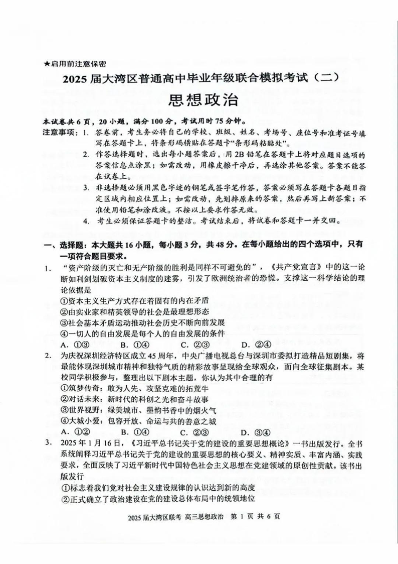 广东省大湾区2025届普通高中毕业年级联合模拟考试(二模)政治