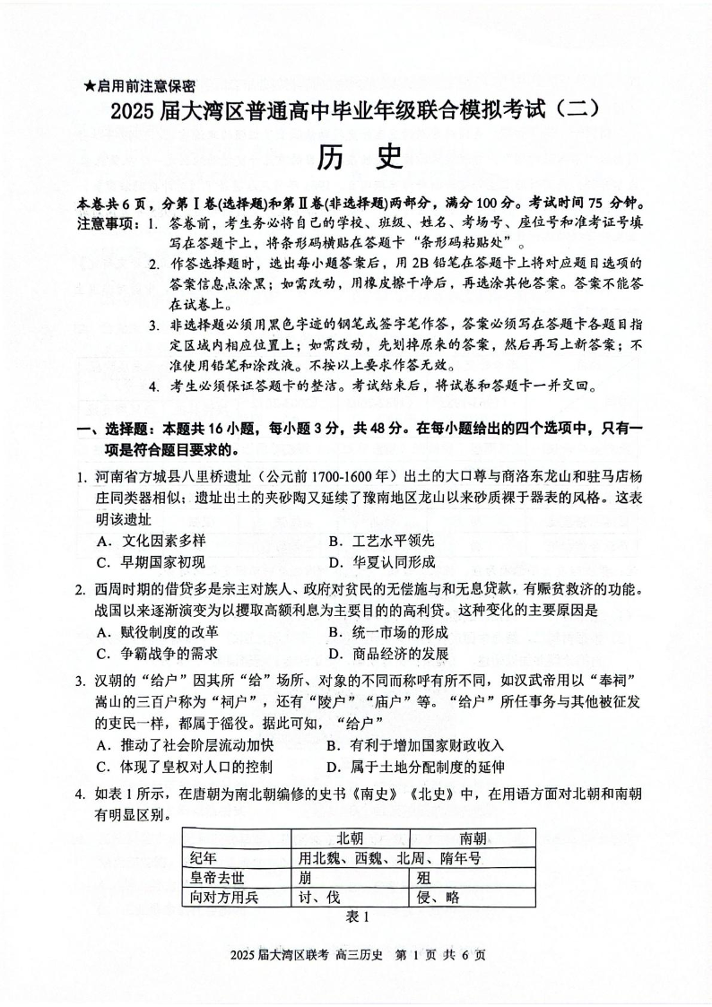 广东省大湾区2025届普通高中毕业年级联合模拟考试(二模)历史+答案