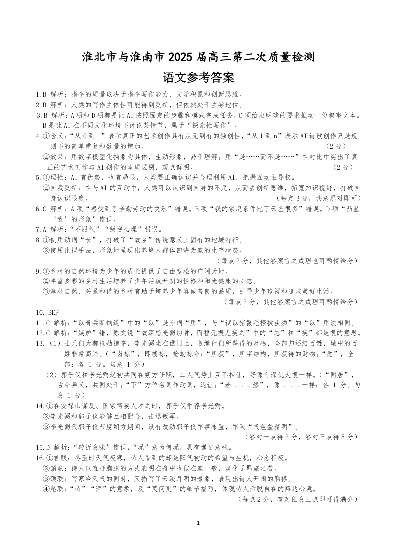 安徽省淮北和淮南市2024-2025学年高三二模质量检测语文答案