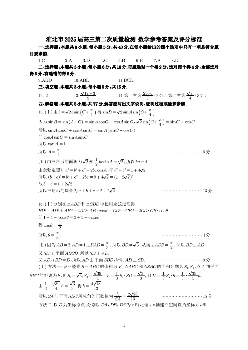 安徽省淮北和淮南市2024-2025学年高三二模质量检测数学答案