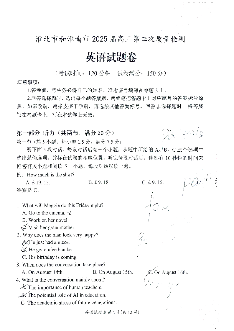 安徽省淮北和淮南市2024-2025学年高三二模质量检测英语