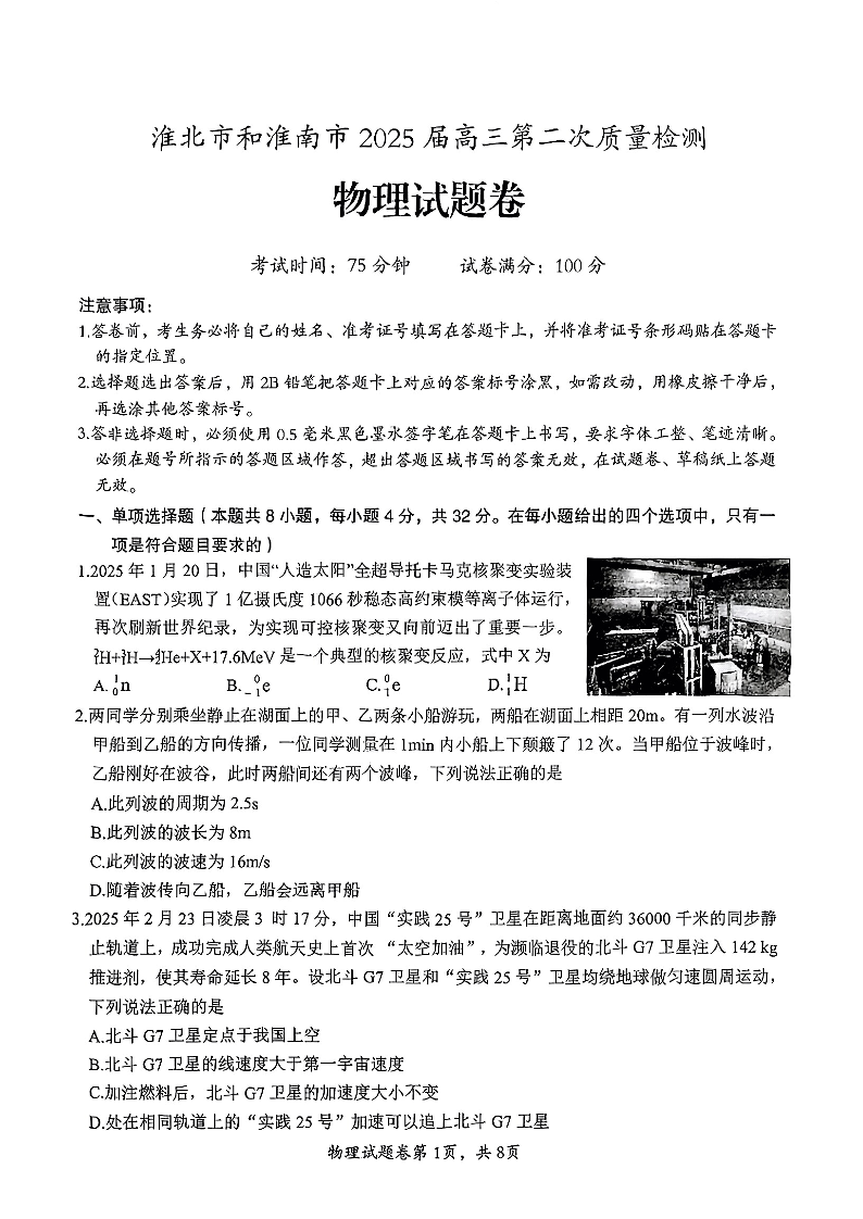 安徽省淮北和淮南市2024-2025学年高三二模质量检测物理