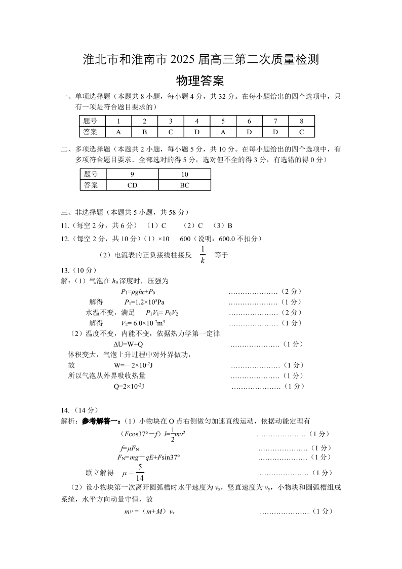 安徽省淮北和淮南市2024-2025学年高三二模质量检测物理答案