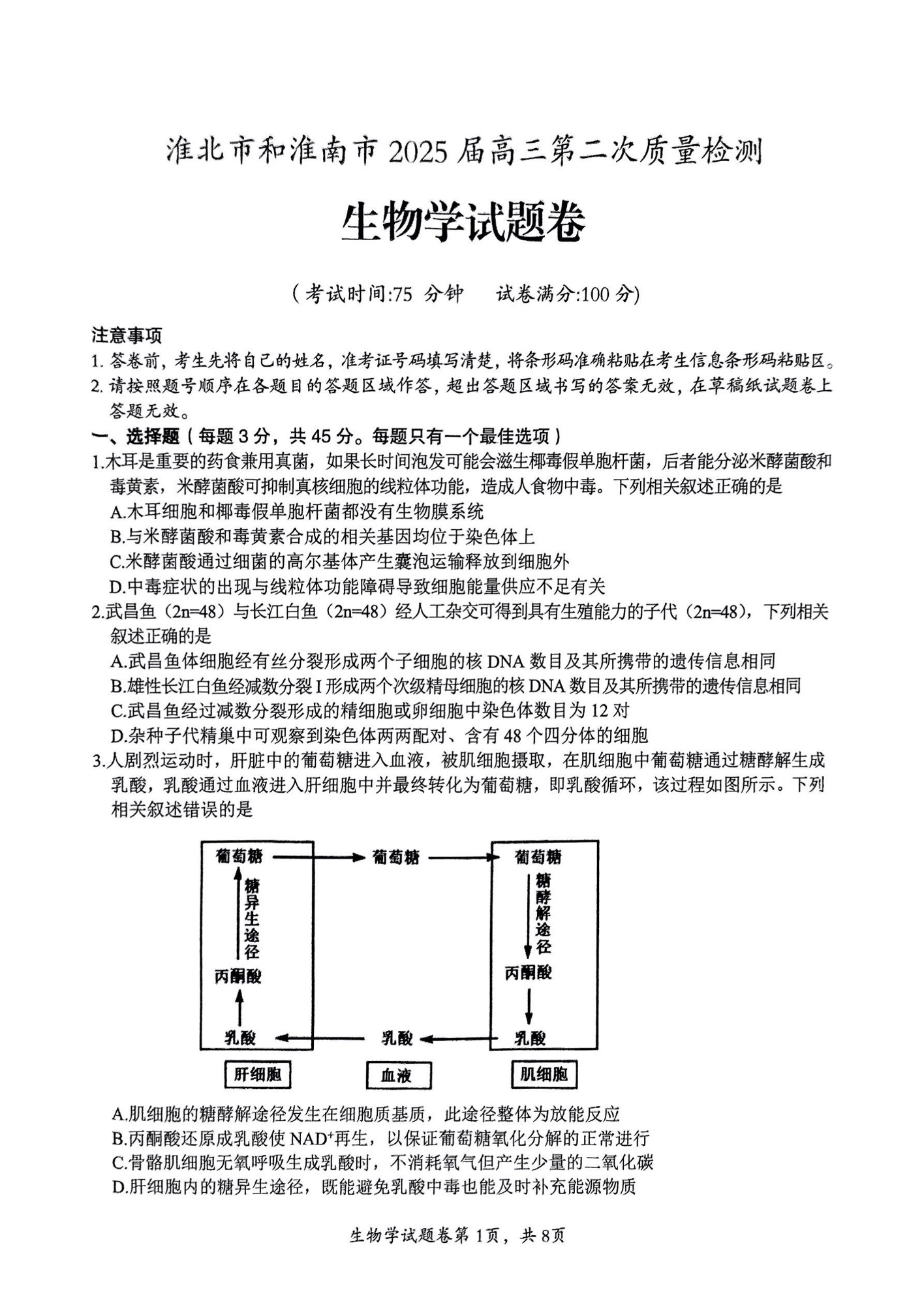 安徽省淮北和淮南市2024-2025学年高三二模质量检测生物