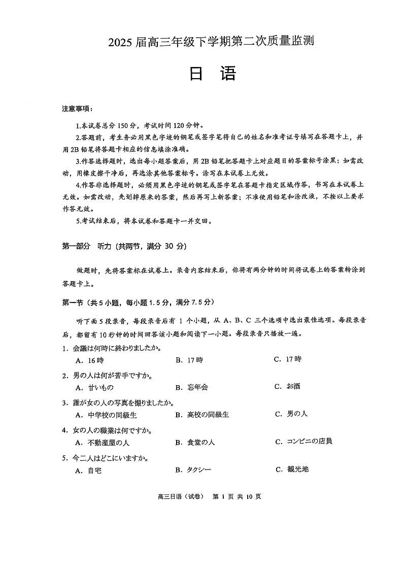 广东省广州市普通高中毕业班2025年综合测试(二模)日语