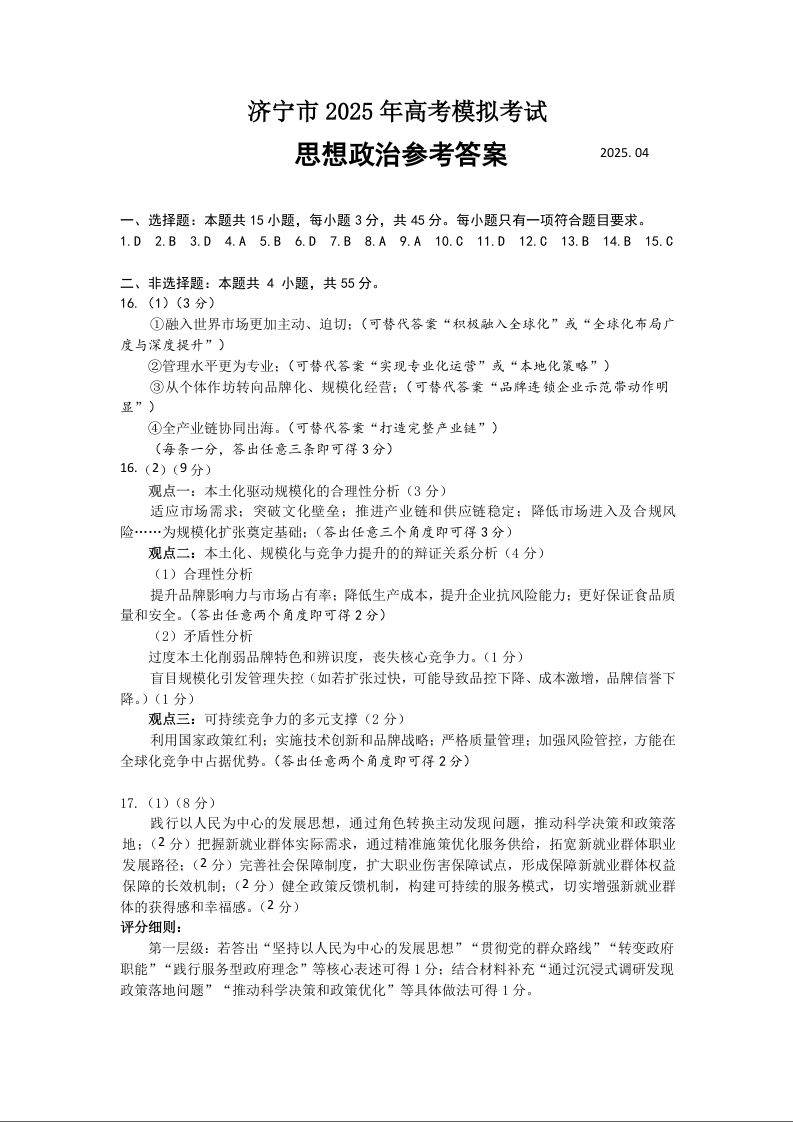 山东省济宁市2024-2025学年下学期4月高三二模统考政治答案