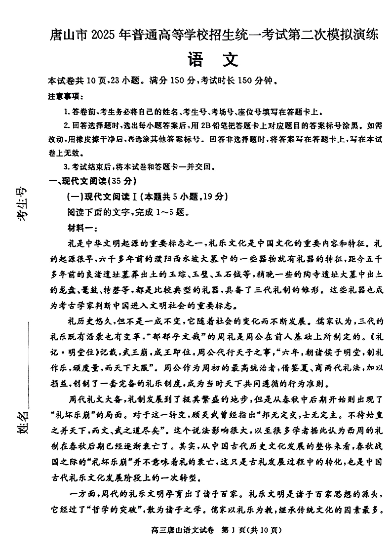 河北省唐山市2024-2025学年下学期高三二模演练语文