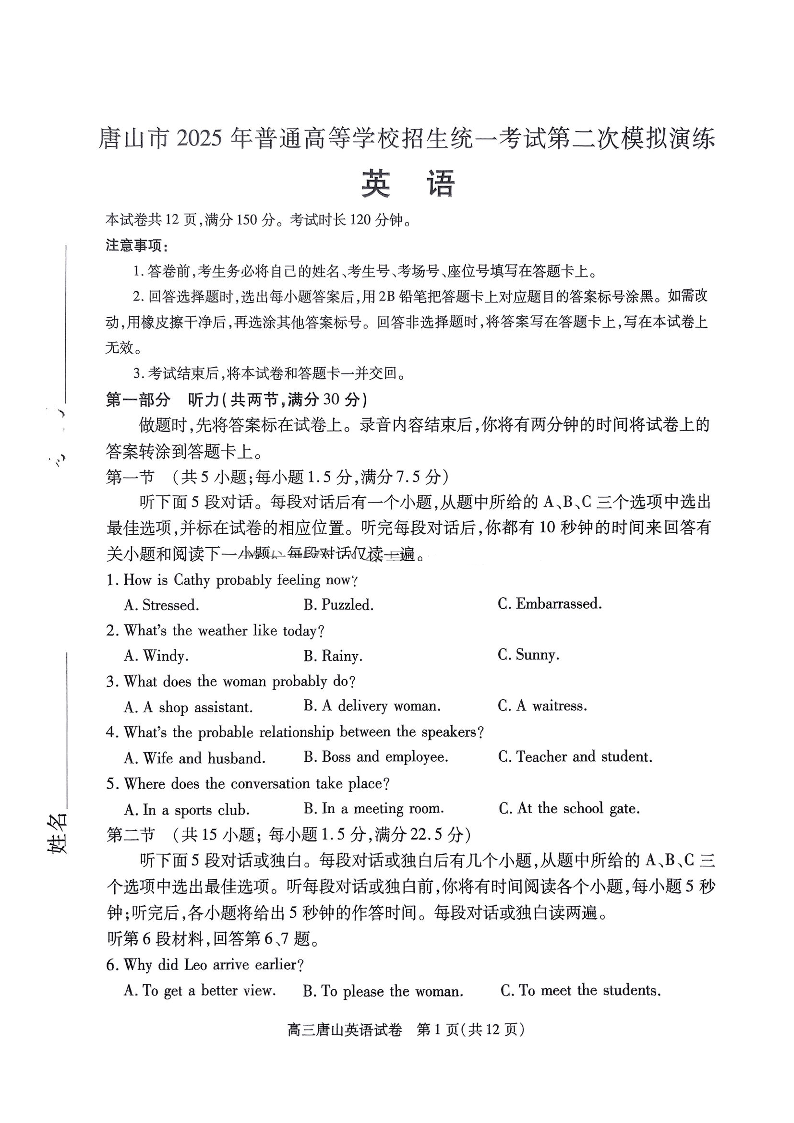 河北省唐山市2024-2025学年下学期高三二模演练英语