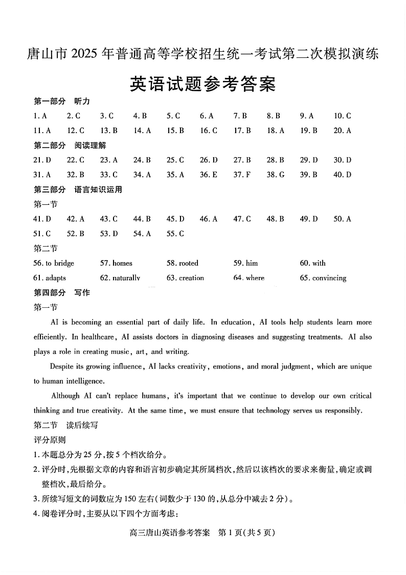 河北省唐山市2024-2025学年下学期高三二模演练英语答案
