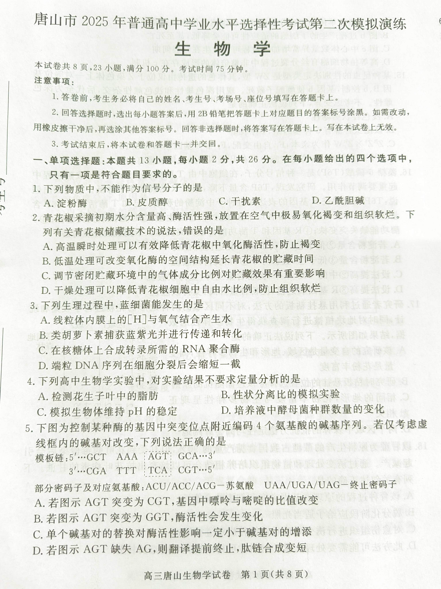 河北省唐山市2024-2025学年下学期高三二模演练生物