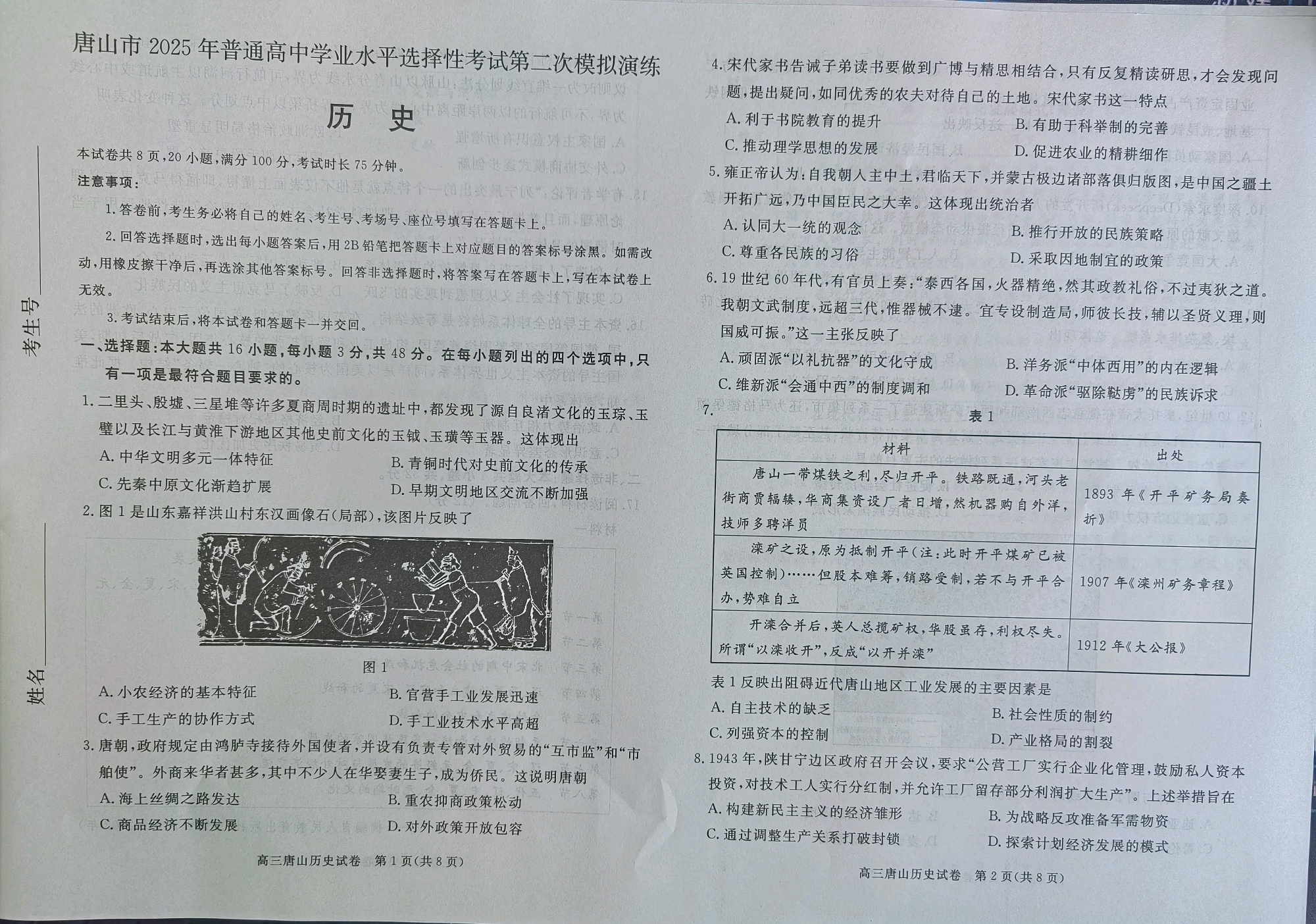 河北省唐山市2024-2025学年下学期高三二模演练历史