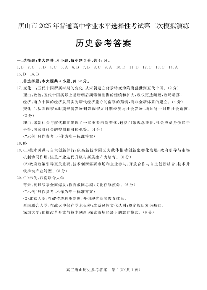 河北省唐山市2024-2025学年下学期高三二模演练历史答案