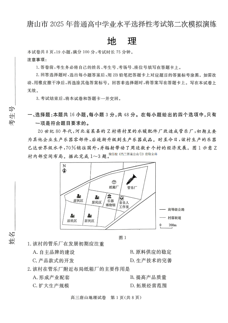 河北省唐山市2024-2025学年下学期高三二模演练地理+答案