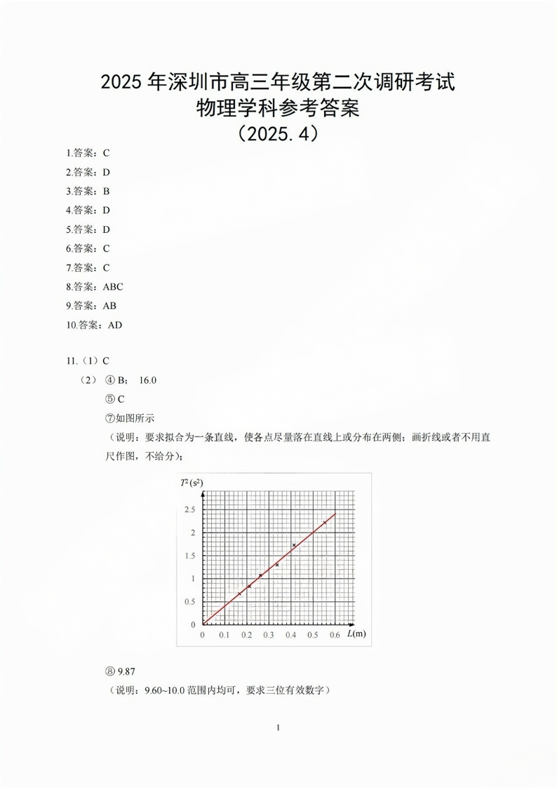 广东省深圳市2024-2025学年高三二模调研考物理答案