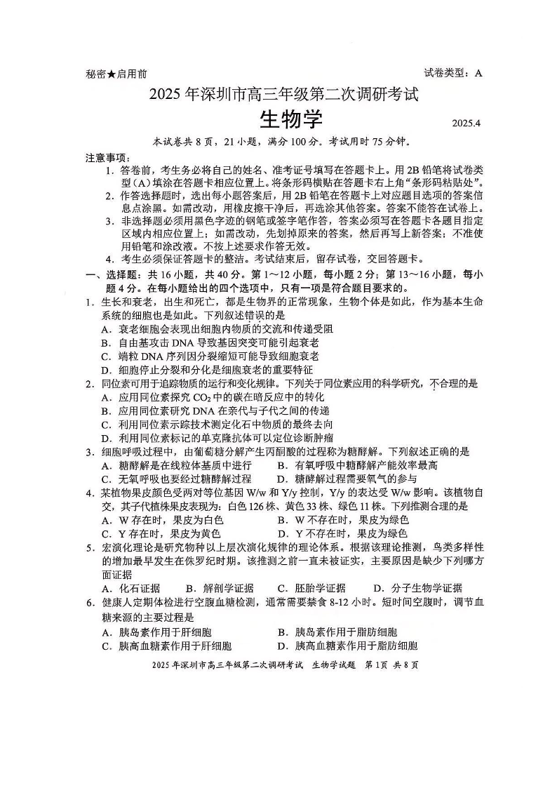 广东省深圳市2024-2025学年高三二模调研考生物