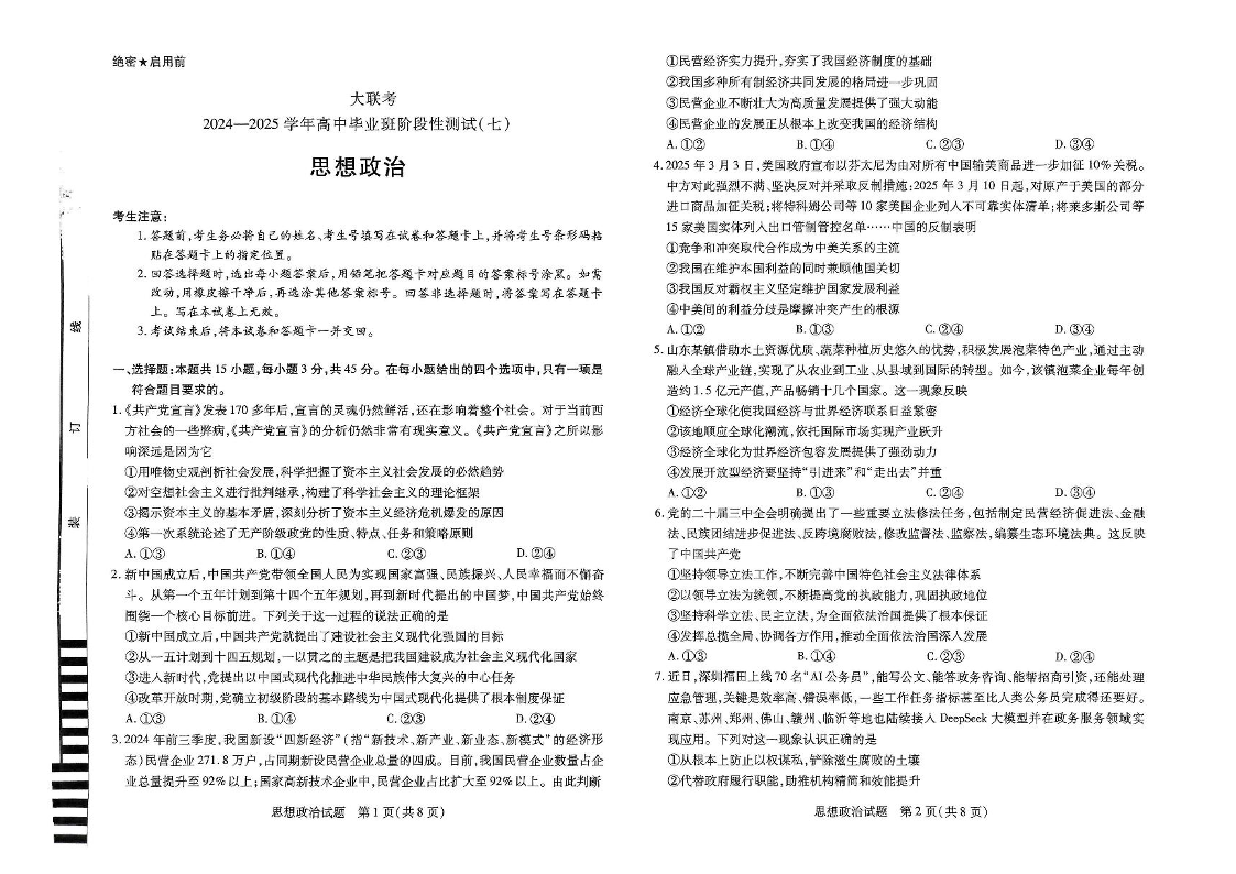 河南省区域高中2024-2025学年下高三阶段性测试(七)政治+答案