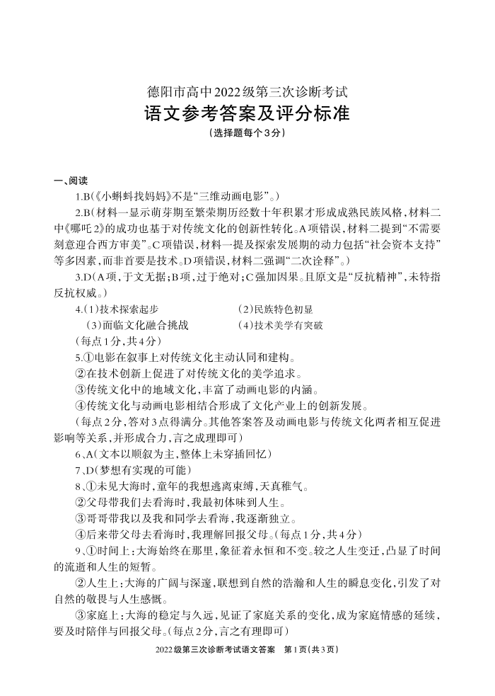 四川省德阳市高中2024-2025学年高三三诊断考试语文答案