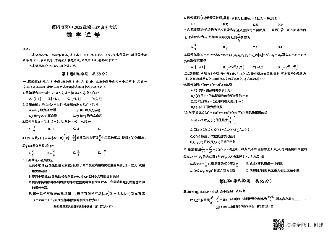 四川省德阳市高中2024-2025学年高三三诊断考试数学
