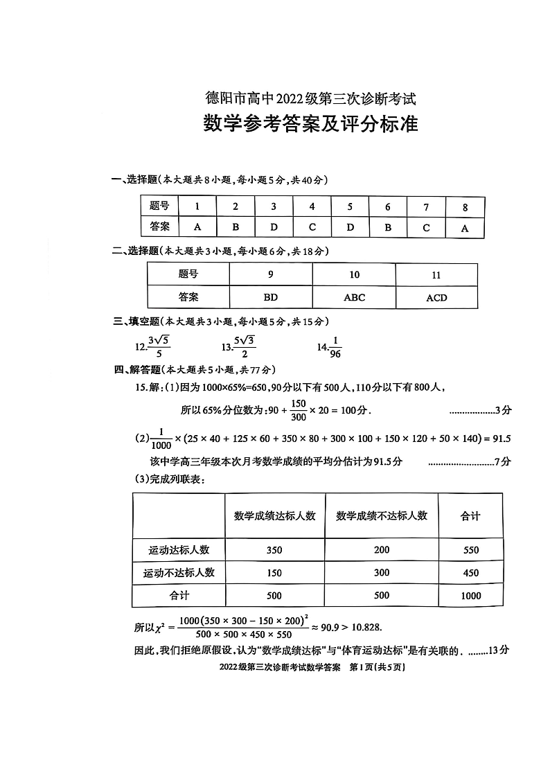 四川省德阳市高中2024-2025学年高三三诊断考试数学答案