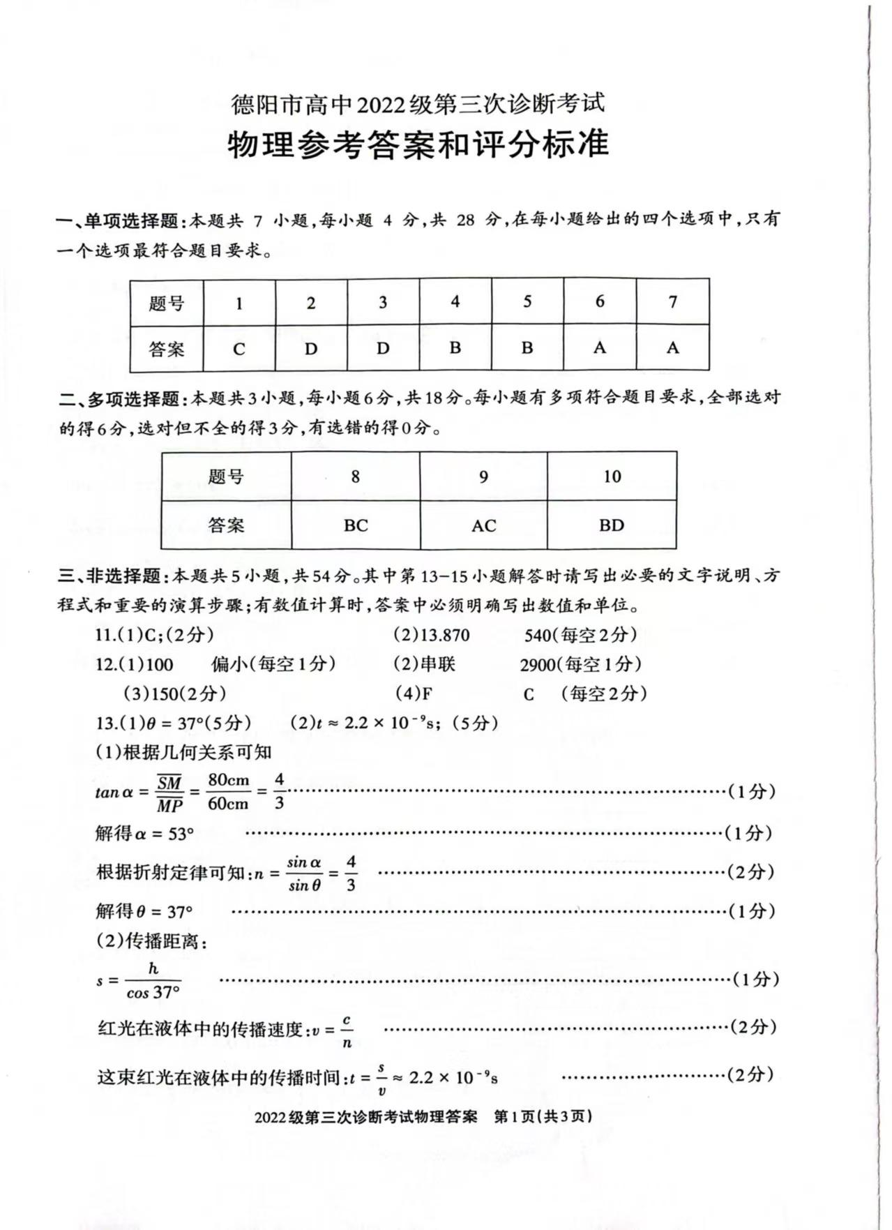 四川省德阳市高中2024-2025学年高三三诊断考试物理答案