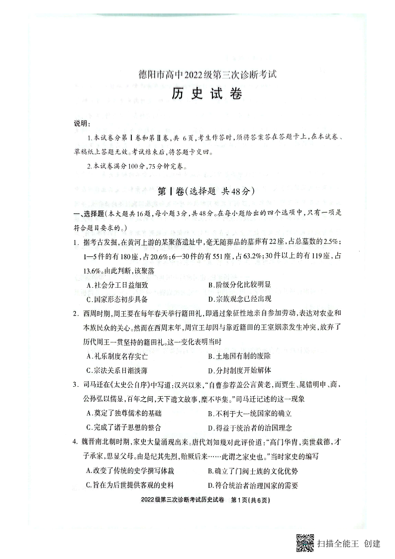 四川省德阳市高中2024-2025学年高三三诊断考试历史