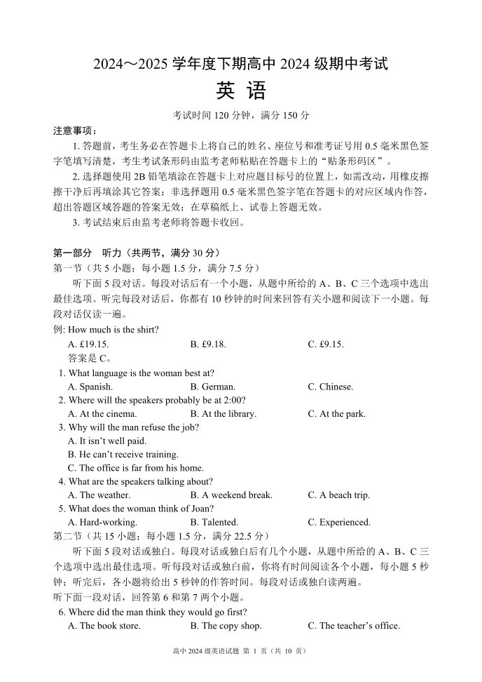 四川省成都市蓉城名校联盟2024-2025学年下学期高一期中考试英语