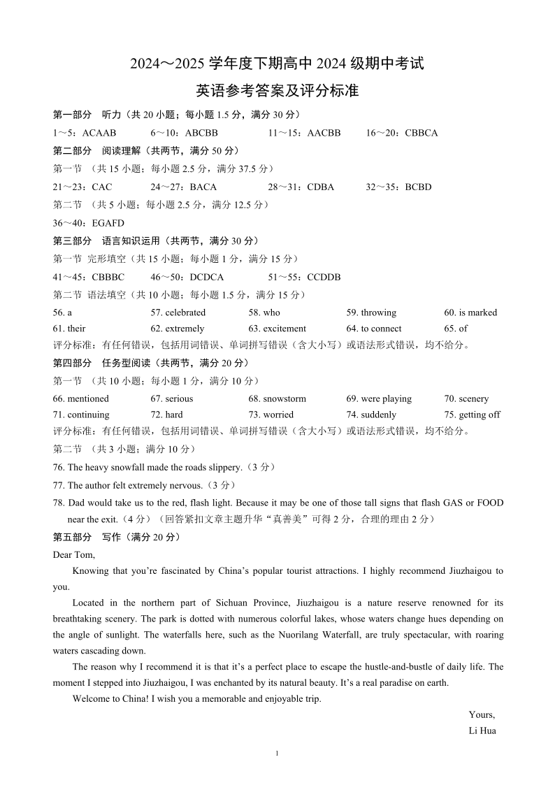 四川省成都市蓉城名校联盟2024-2025学年下学期高一期中考试英语答案