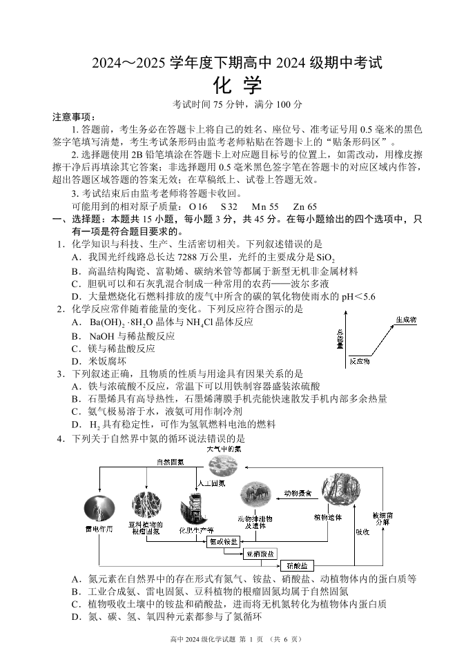 四川省成都市蓉城名校联盟2024-2025学年下学期高一期中考试化学