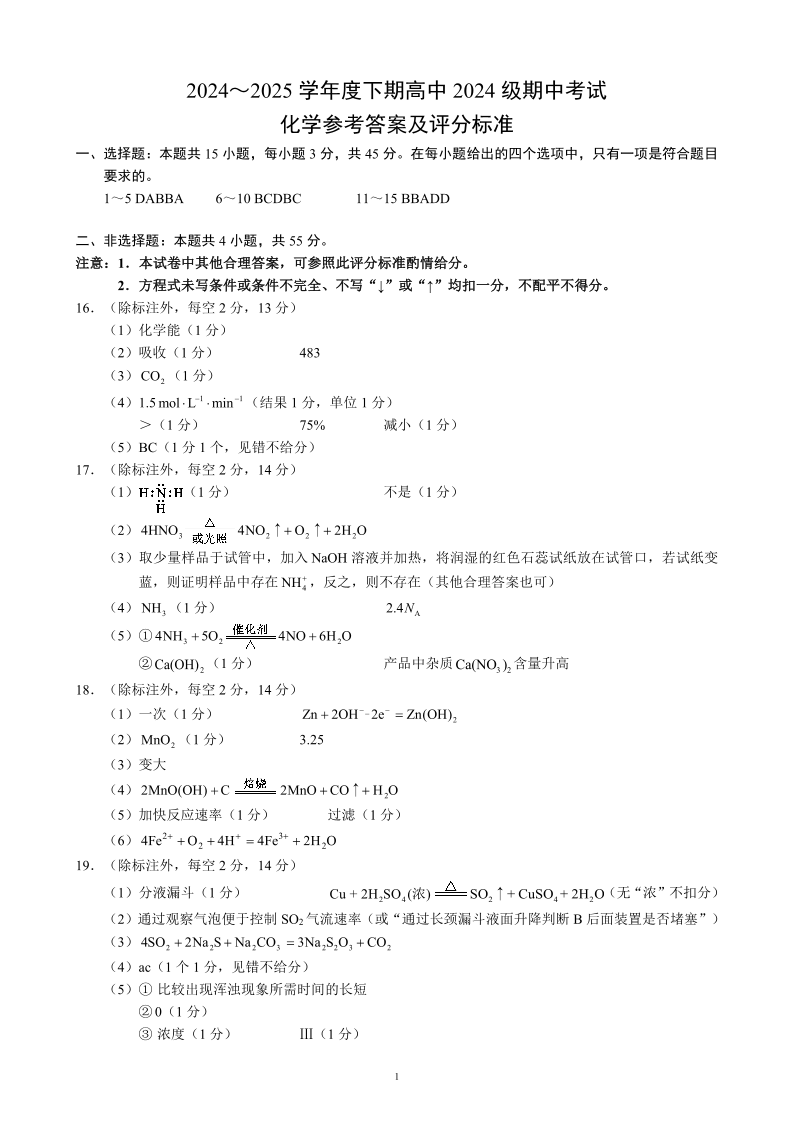 四川省成都市蓉城名校联盟2024-2025学年下学期高一期中考试化学答案