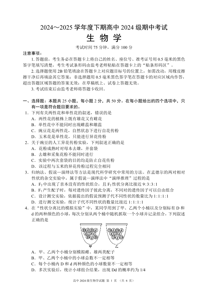 四川省成都市蓉城名校联盟2024-2025学年下学期高一期中考试生物