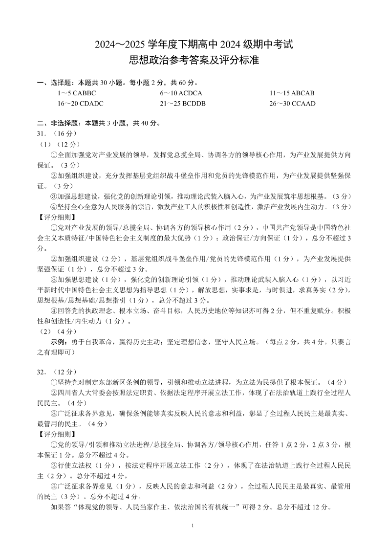 四川省成都市蓉城名校联盟2024-2025学年下学期高一期中考试政治答案
