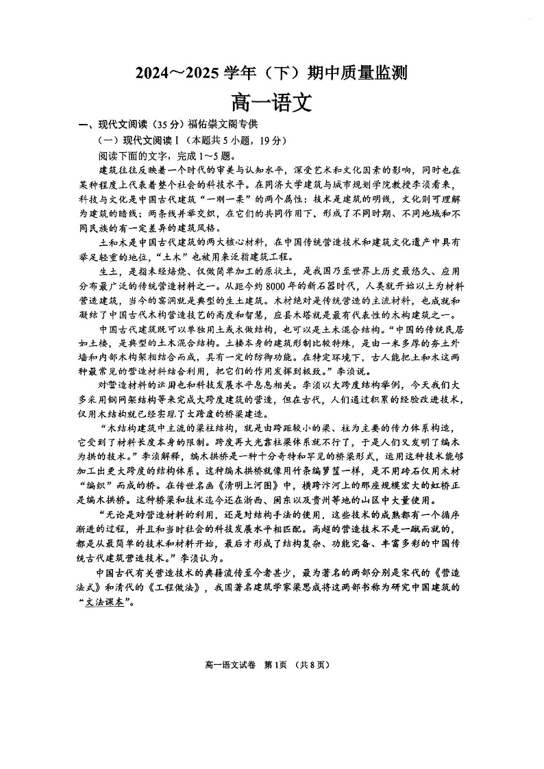 江苏省南通市2024-2025学年下学期高一期中考试语文+答案