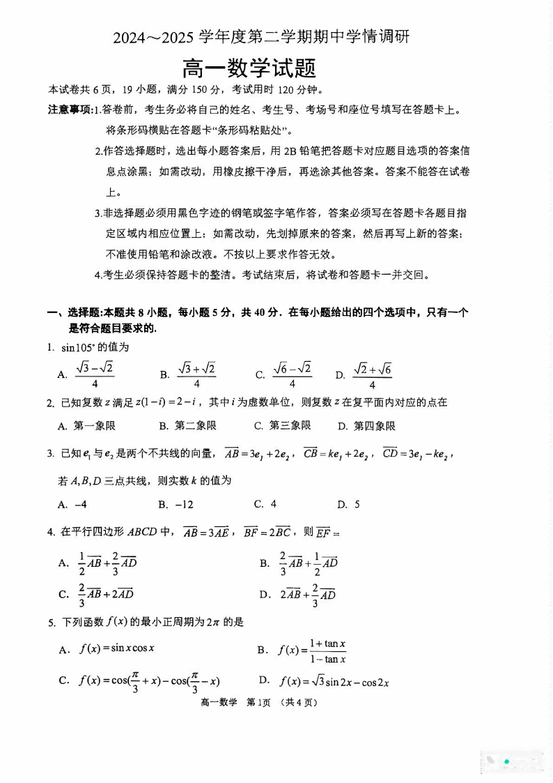 江苏省徐州市铜山区2024-2025学年下学期4月高二期中学情调研数学