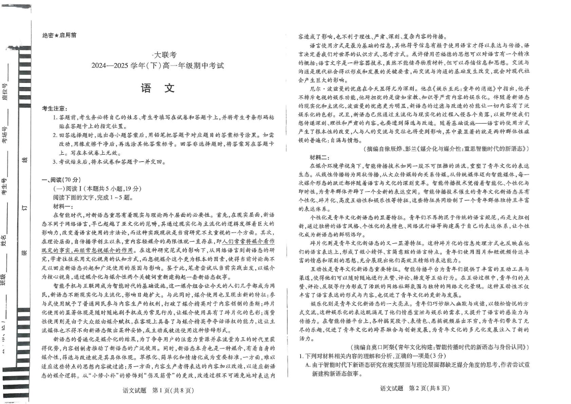 河南省区域2024-2025学年下学期4月高一期中联考语文