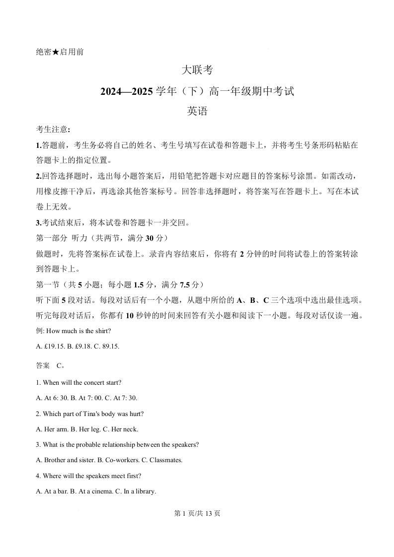 河南省区域2024-2025学年下学期4月高一期中联考英语(原卷版)
