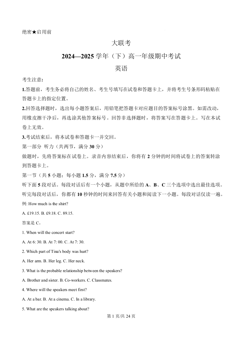 河南省区域2024-2025学年下学期4月高一期中联考英语(精品解析版)