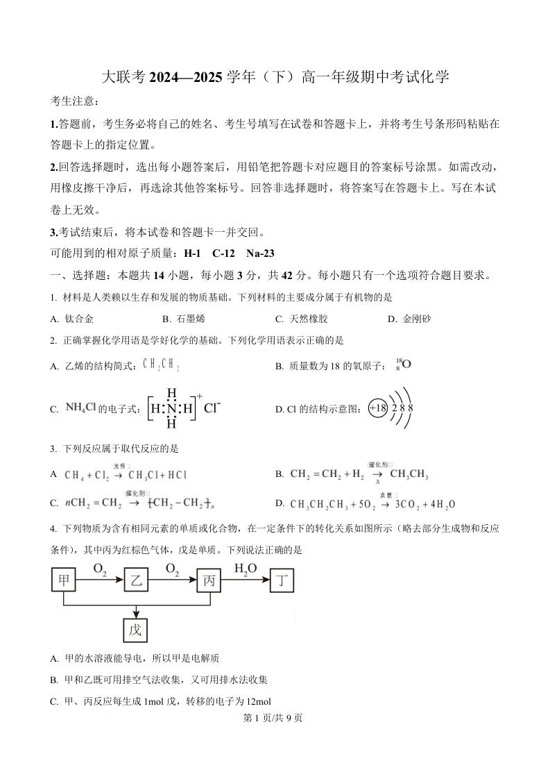 河南省区域2024-2025学年下学期4月高一期中联考化学(原卷版)