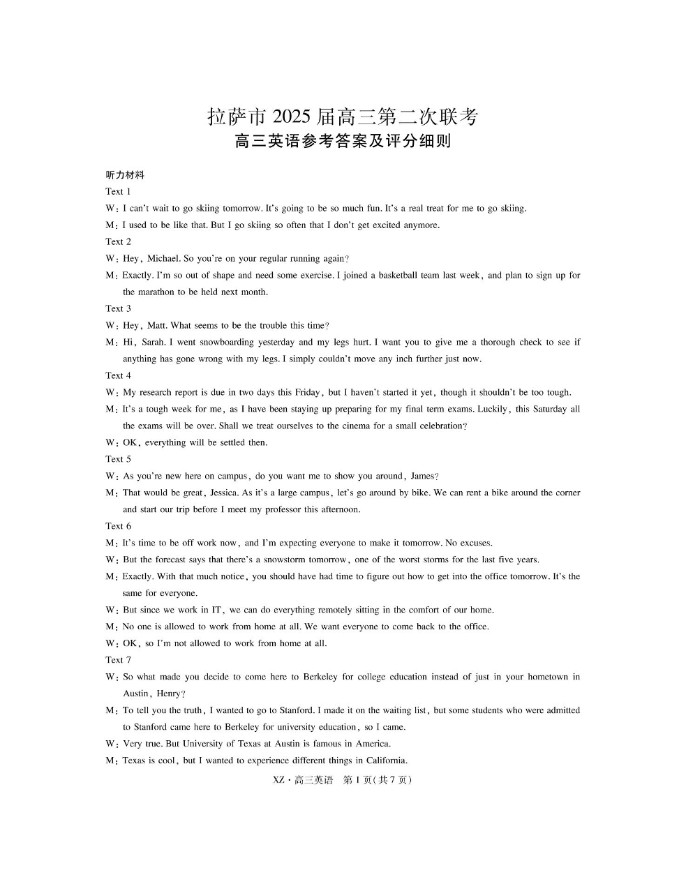 西藏拉萨市2024-2025学年下学期高三第二次模拟英语答案