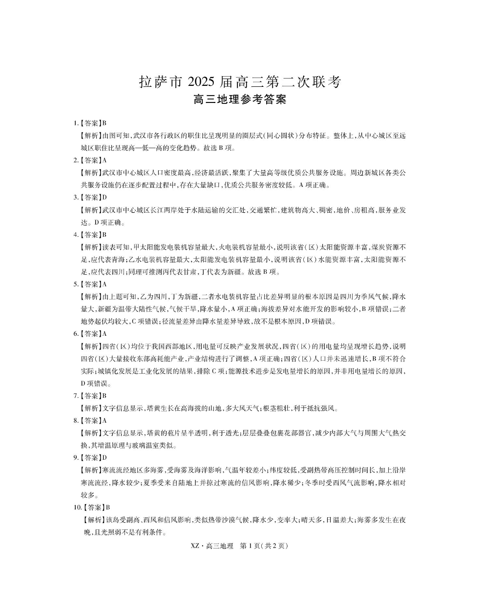西藏拉萨市2024-2025学年下学期高三第二次模拟地理答案